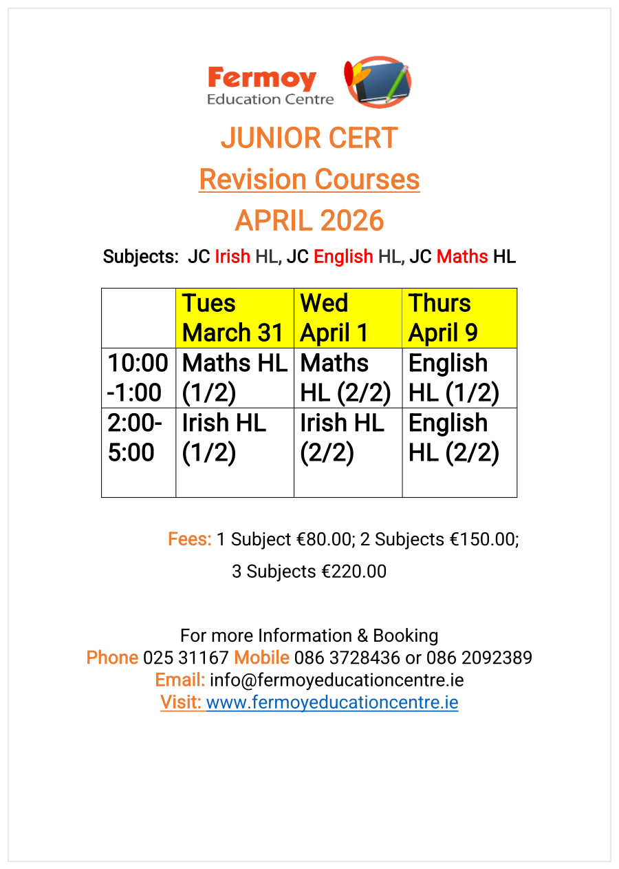 Fermoy Education Centre will organise Revision Courses in core Leaving and Junior Cert subjects throughout the academic year.