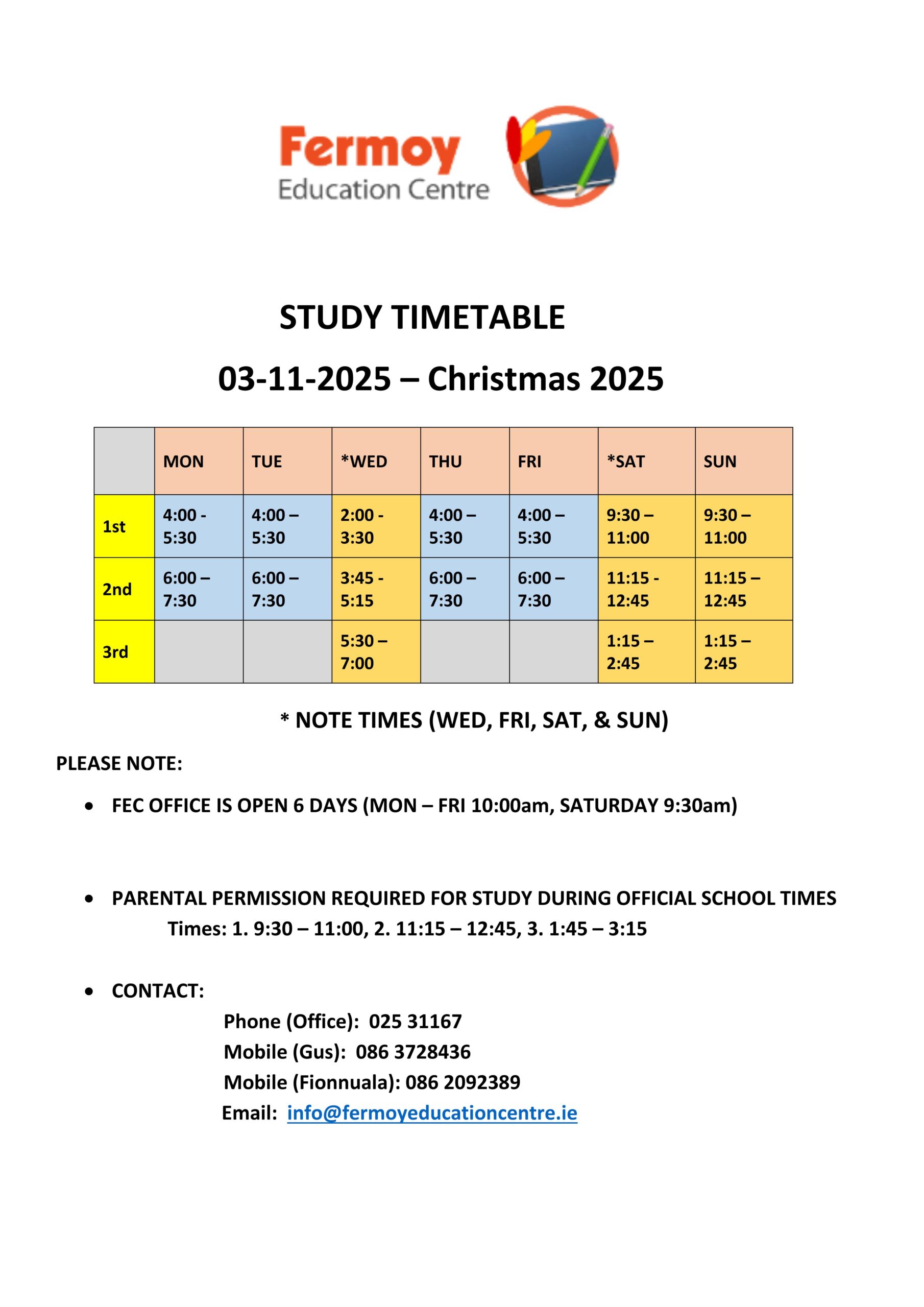 Study Timetable November – Christmas 2025